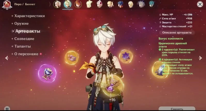Наиболее подходящим сетом для Беннета является Церемония древней знати. Если же у вас возникли трудности с получением всего набора, то можете попробовать заменить его комплектами, указанными ниже (от лучшего к худшему).