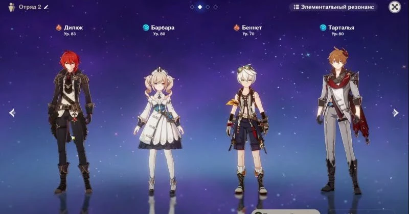 - Второстепенный DPS: Фишль (обеспечивает команду статусным эффектом «Перезагрузка»).
