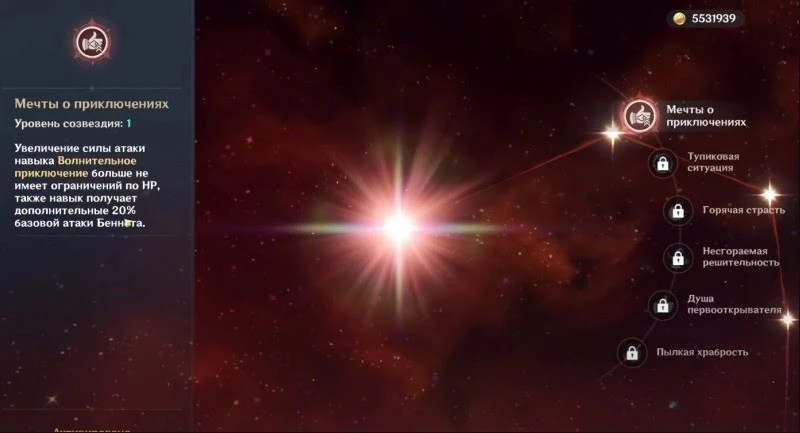 Таланты открываются с помощью «удачи персонажа», которая выдается при получении копий бойца. Ниже указан список созвездий Беннета: