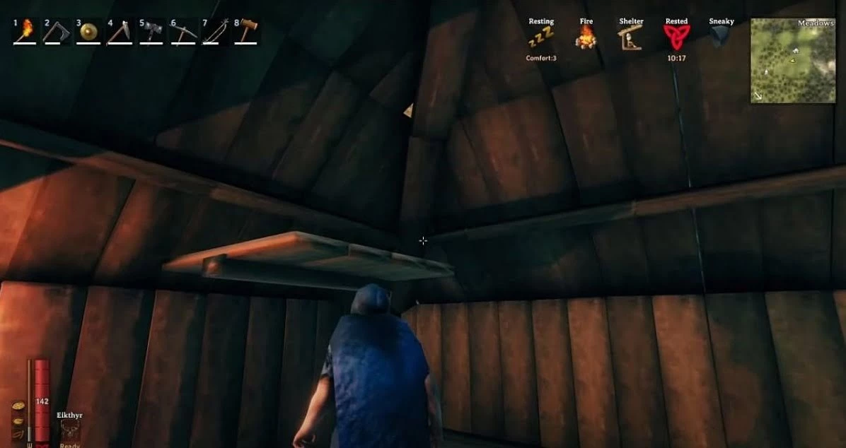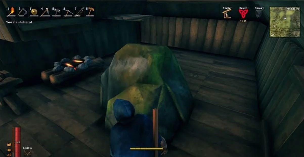 Первым делом нужно построить небольшую тренировочную площадку. Найдите большой камень. Разровняйте вокруг него землю и постройте дом размером 5 на 6 клеток. Нужно, чтобы валун оказался внутри здания. Вам потребуется примерно 160 единиц дерева (wood). Необходимо построить пол, стены и потолок, а внутри развести костёр и обеспечить дымоход. Внутри здания вы будете иметь статусы «отдых» (resting) и «бодрость» (rested), которые увеличивают скорость восстановления выносливости.