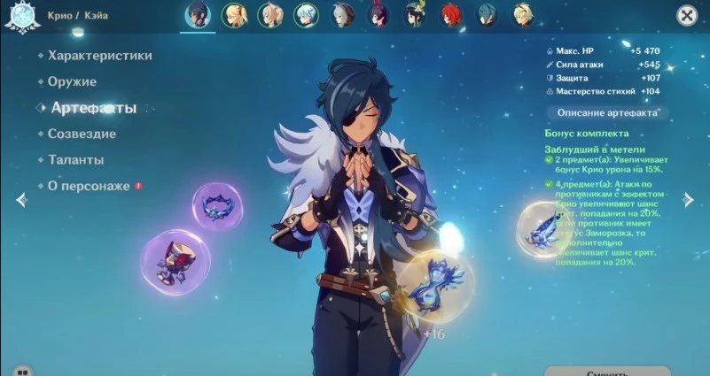 - Второстепенный DPS: Сян Лин (для создания эффекта «Таяние») или Фишль (для создания «Сверхпроводящего урона», который наносит Крио повреждения по области и снижает сопротивляемость врагов к физ. урону)