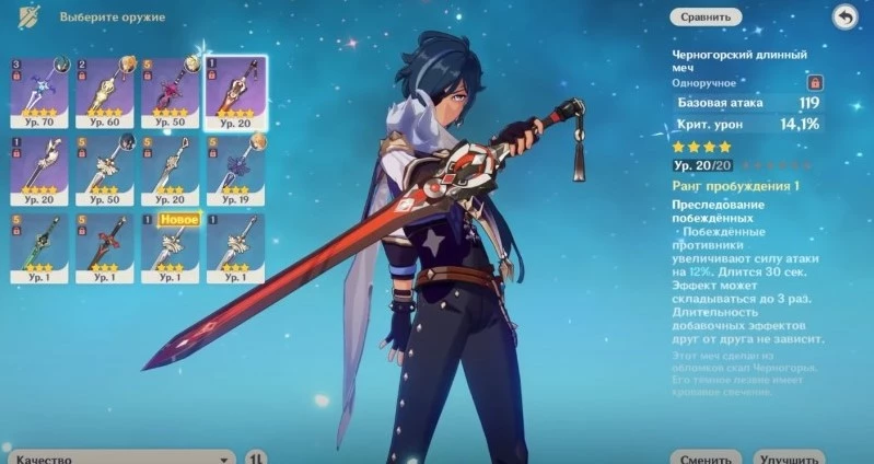 - Черногорский длинный меч (4-звездочный) – убитые враги повышают показатель атаки на 12%. Эффект длится полминуты и складывается до трех раз.