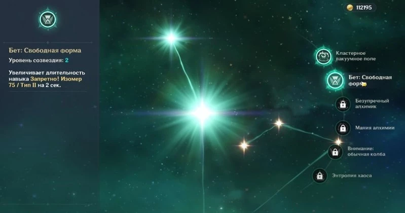 - Энтропия хаоса – в случае, когда во время действия способности «Запретно! Изомер 75 / Тип II» происходит поглощение элемента, у всех членов группы урон от соответствующей стихии повышается на 20 процентов. Эффект длится, пока не завершится навык.
