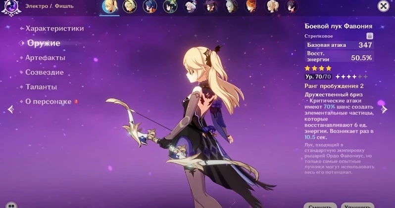 Классический билд для Фишль, который направлен на увеличение ее элементального урона, наносимого с помощью способностей, и восстановление энергии. Для этого необходимо повысить повреждения от электричества и улучшить ее мастерство стихий. Не забывайте также о создании стихийных реакций с основным дамагером. В качестве оружия можете взять: