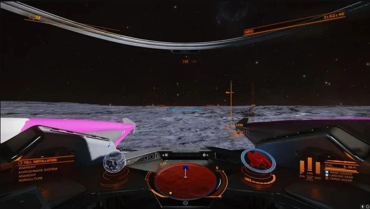 При стыковке с планетарной базой проследовать до 7,5 км от населенного пункта и запросить стыковку. Если вы приземляетесь для добычи полезных ископаемых или в целях разведки, найдите плоское место немного больше, чем корабль, и начните спуск. На достаточно низкой высоте Сканер начнет показывать поверхность под кораблем. Если оранжевая точка под кораблем, отображаемая на Сканере, становится синей, область под кораблем подходит для посадки.