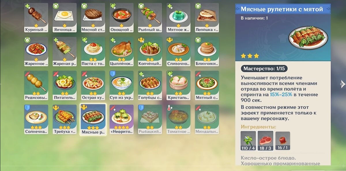 Это очень полезное блюдо, которое может пригодиться большинству игроков Genshin Impact. После использования у всех членов отряда снижается потребление выносливости во время полёта и спринта на 15-25% в течение 900 секунд. В совместном режиме эффект распространяется только на вашего персонажа.