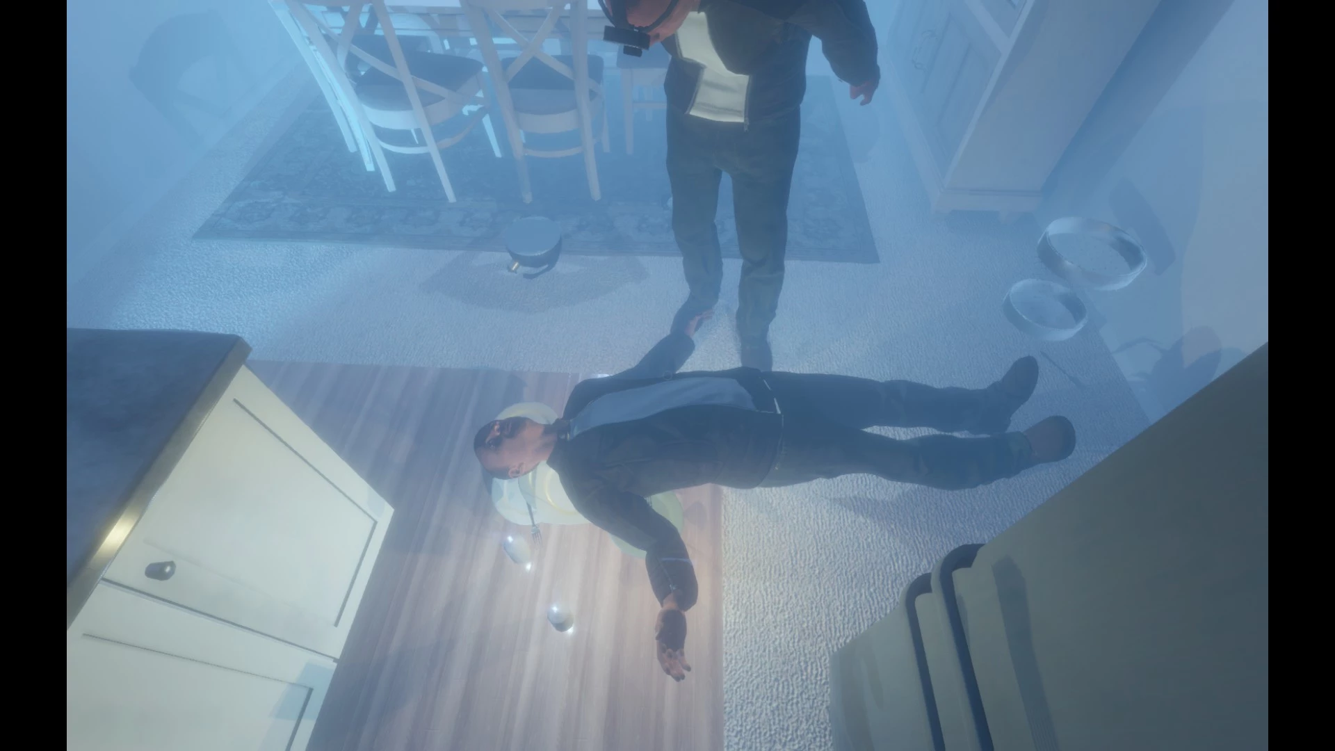 Во время исследования локации призраки могут по-разному реагировать на вопросы, но если вы начнете называть его по имени - будьте осторожны! Призрак может перейти в "фазу атаки", о чем вам скажет мигающий фонарь в вашей руке (если он, конечно же, у вас имеется в инвентаре). Призраки могут кидать в вас вещами, сбрасывать предметы на пол или скидывать картины со стен. Чтобы не оказаться схваченным - прячьтесь в укромном месте, например в шкафу (товарищу на скриншоте явно не повезло).