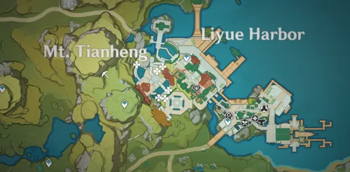 В гавани Лиюэ есть около шести разных мест для Шелковых цветов. Вот места, которые вы можете посетить на карте: