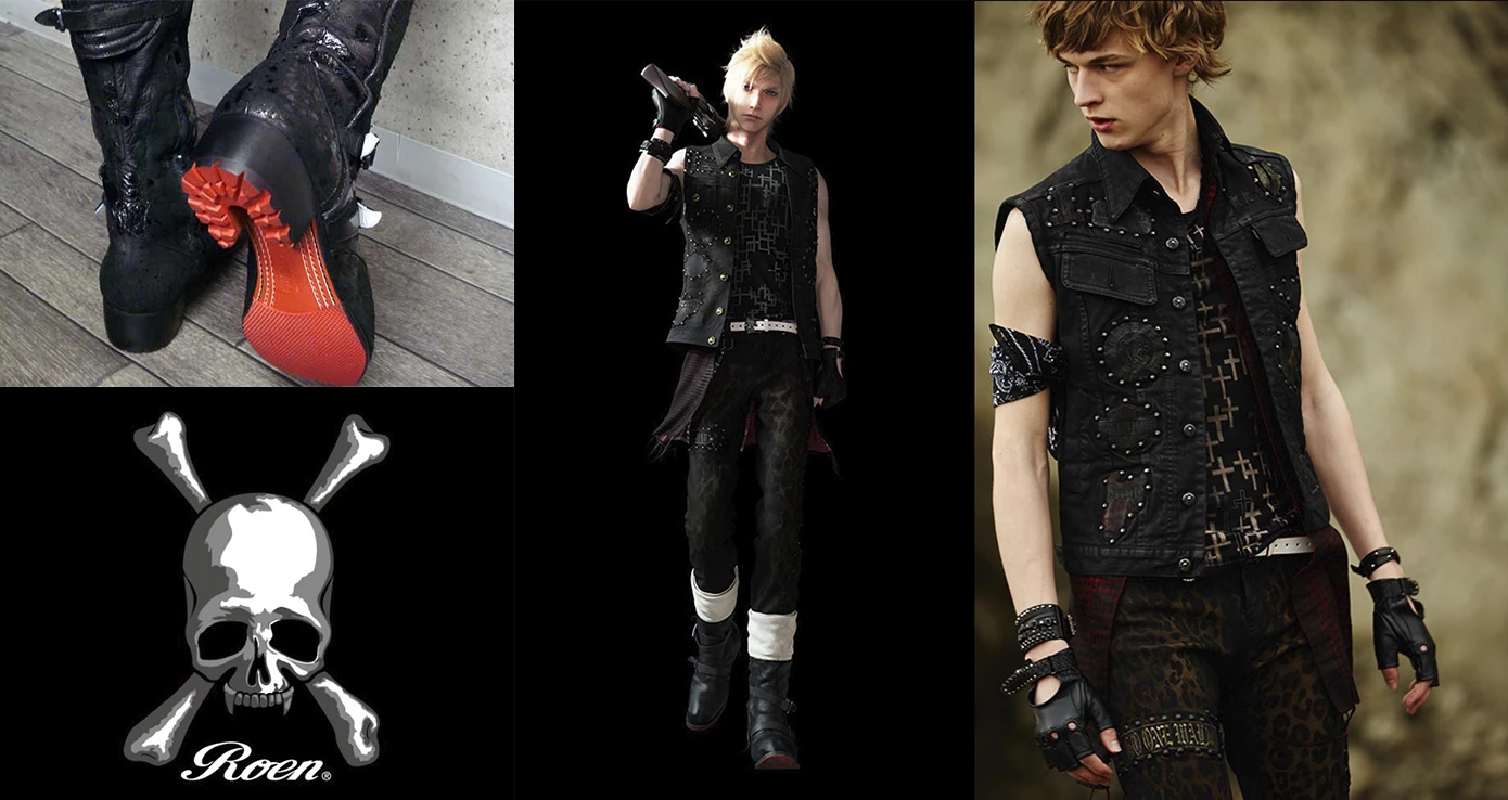 Японский бренд одежды в стиле панк - Roen, работал над дизайном одежды для пяти главных героев игры, а именно для Ноктиса, Промпто, Кора, Гладио и Игниса. Основной изюминкой образа героев является красная подошва на обуви и зловещие черепа на одежде в виде различных нашивок, пуговиц и вышивок.