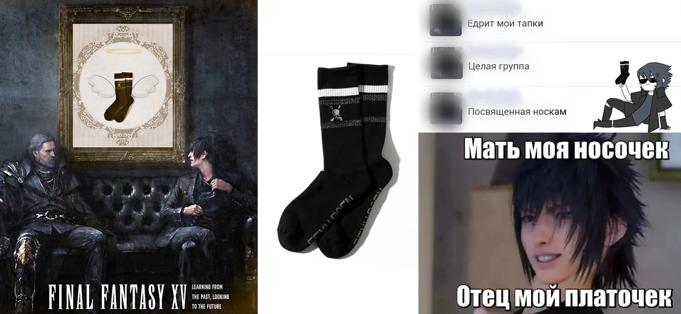 Вы не поверите, но после презентации одежды Roen и объявления на нее "заоблачных" цен, в сети появилась группа фанатов, которая начала обожествлять носки принца Ноктиса! Ребята даже создали свою церковь и дали название этому культу - "Ноктопотниковая епархия", а еще они придумали забавную легенду о "явлении носков принца народу".