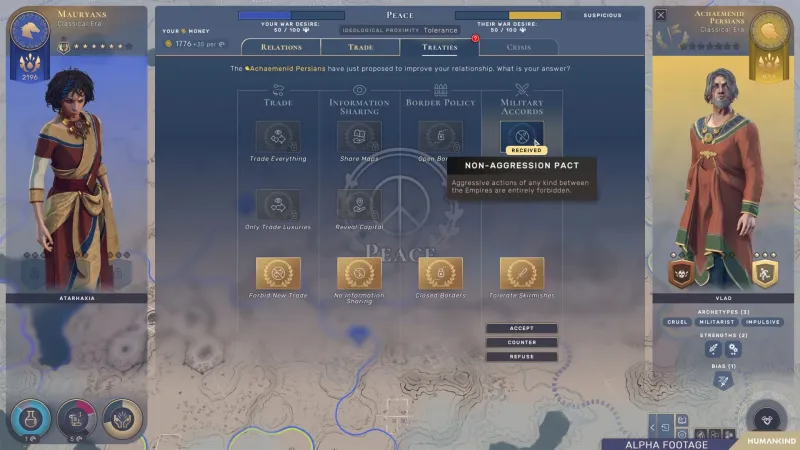 Мы также хотели, чтобы дипломатия в Humankind была основана на пространстве игры, поэтому многие дипломатические действия (например, торговля) привязаны к определенным местам на карте. Более того, дипломатия должна ощущаться незамедлительной и действенной, делая предложения, декларации и требования с заметным эффектом, а не обсуждать детали сделки вплоть до последней золотой монеты. Этот подход состоит из трех частей: договоры, торговля и претензии и требования.