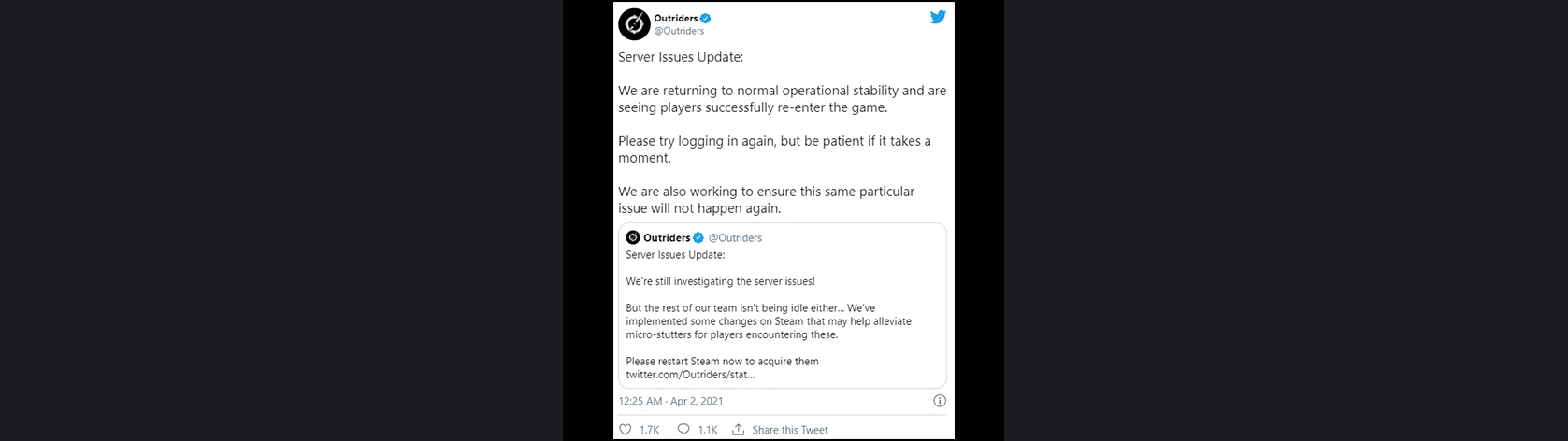 Вы так же можете проверить официальный статус сервера Outriders на их веб-сайте.