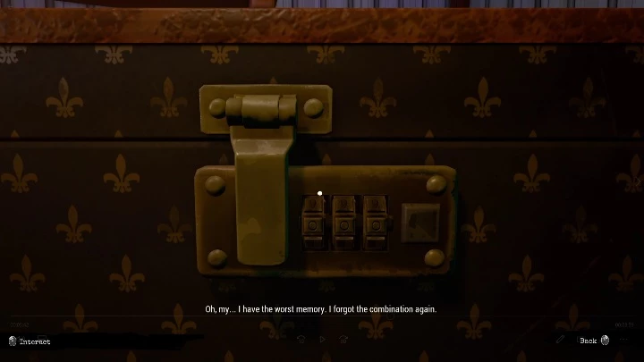 Чемодан заперт трехзначным кодом. Героиня сразу же упомянет, что она всегда забывает об этом. Однако она уверена, что где-то это записала.