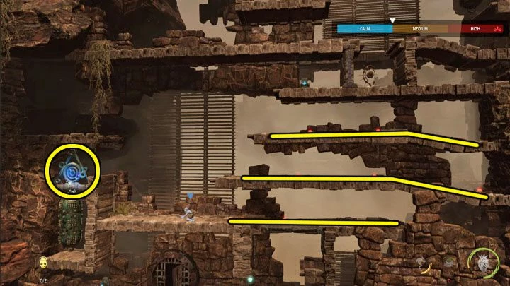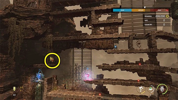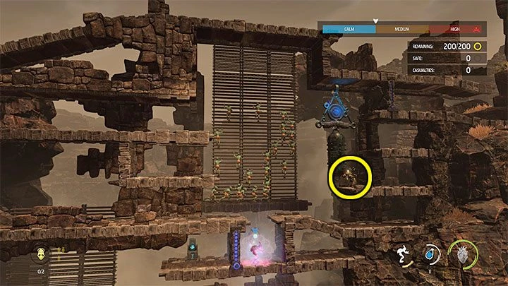 Одержимый Слиг оснащен гранатометом, который идеально подходит для уничтожения других врагов. Однако помните, что гранаты летят не по прямой. Мы должны помнить об этом особенно в случае Слигов с верхней левой полки (см. рисунок выше), потому что их легко пропустить и, следовательно, способствовать гибели некоторых убегающих Мудоконов.