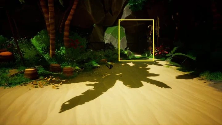 Чтобы получить эту подсказку, вам нужно войти в пещеру с левой стороны пляжа. Все, что вам нужно сделать, это пройти несколько шагов в темную пещеру, и вы увидите свет. Когда дойдете до конца пещеры, загляните в отверстие в скалах. Посмотрите на три красных элемента.
