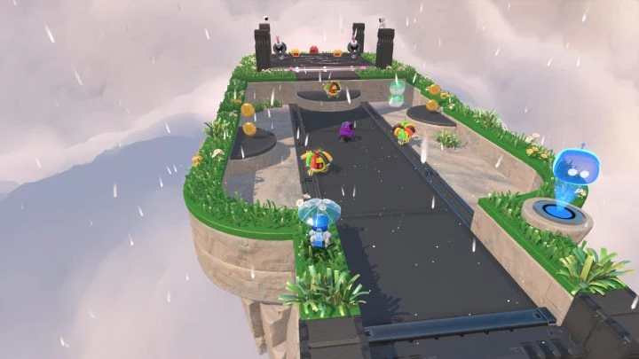 Поднимитесь по лестнице и соберите монеты из желтого контейнера. Подойдите к объекту в форме цветка и поразите его мощной атакой. Платформа сдвинется с земли.