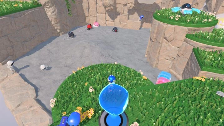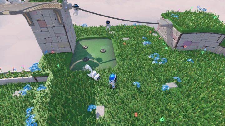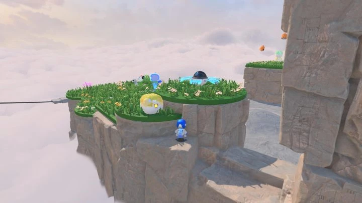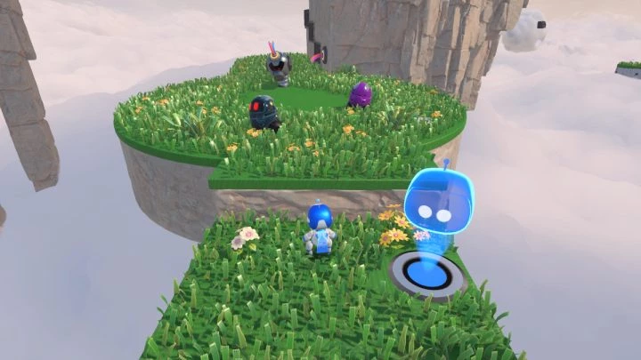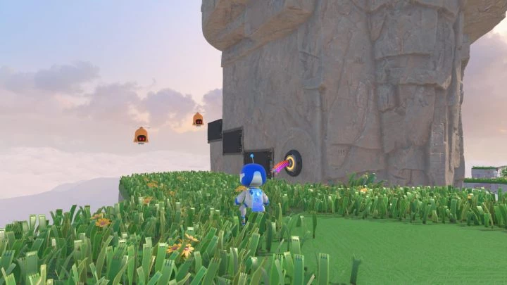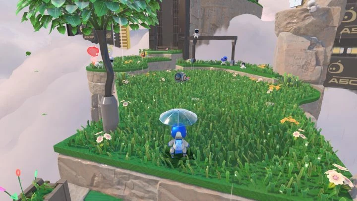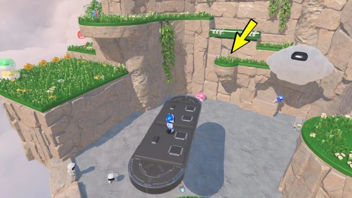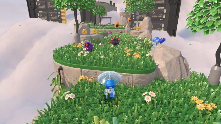 Здесь вы найдете 2 новых противников. Первый из них ходит по траве. Подождите, пока он не прыгнет в вашу сторону, и быстро убегайте. Когда он ударится о землю, бегите к противнику и дергайте за кабели. У скал серая площадка. Идите под это. Астро деактивирует зонт - это разблокирует Джейсона! трофей.