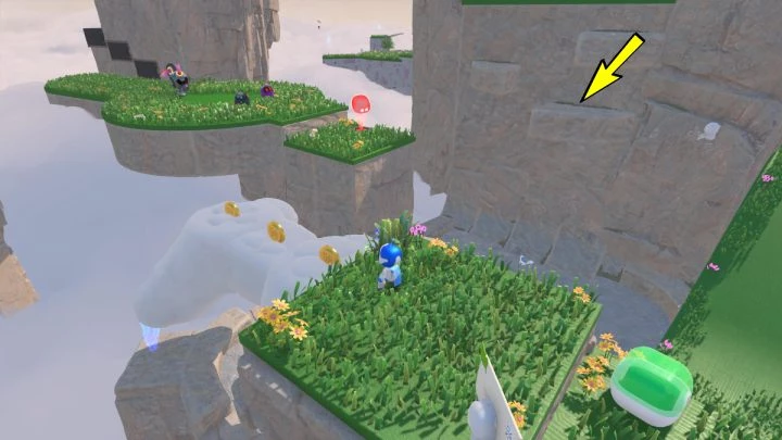 Спрыгивайте и приземляйтесь рядом с группой ботов. Собирайте монеты и спускайтесь по лестнице к облаку. Там вы найдете зеленый контейнер с монетами.