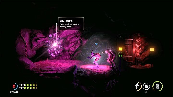 Двигаясь дальше налево, мы доберемся до одинокого больного Мудокона. Подойдите к нему и подойдите к новому Птичьему Порталу в левом конце пути. Его активация освободит всех мудоконов, которые до сих пор следовали за Абэ.