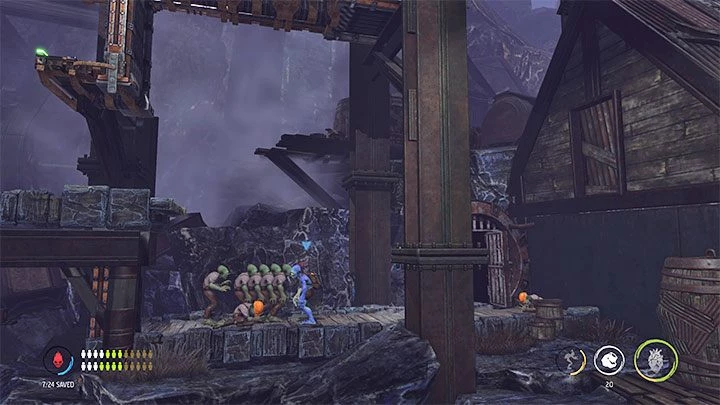 Финальная часть этапа начинается с активации вагонетки с помощью 7 мудоконов, путешествующих с Эйбом. Как только вы окажетесь на новом месте, не идите прямо налево. Вместо этого давайте сначала исследуем область справа от вагонетки.