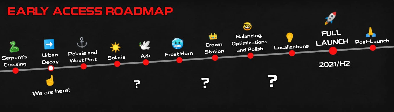 Мы пересмотрели нашу дорожную карту раннего доступа, чтобы отразить обновления, которые мы сделали до сих пор, и обновления, запланированные до полного запуска. Могут произойти незначительные изменения, но это общая картина. Вы найдете более удобную прокручиваемую версию диаграммы внутри игры на экране журнала изменений. Вы также можете заметить, что полный запуск летом 2021 года превратился в зловещий 2021 / полугодие, но мы все еще надеемся запустить его ближе к июлю, чем к декабрю. У нас также запланированы кое-какие вещи после запуска, но пока рано об этом говорить.