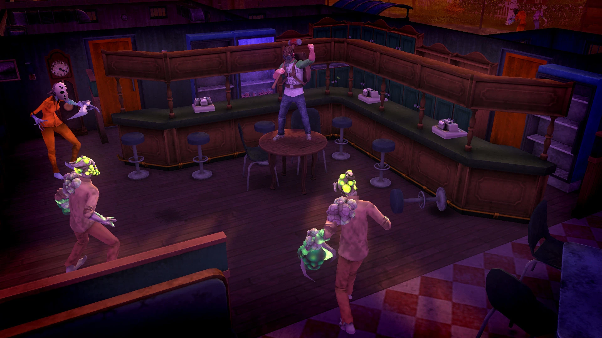В глубине города есть паб, где можно приятно провести время с другими завсегдатаями. (Это скриншот-макет. Вам не разрешается стоять на таких столах. Если бы вы это сделали, вас бы вышвырнули.)
