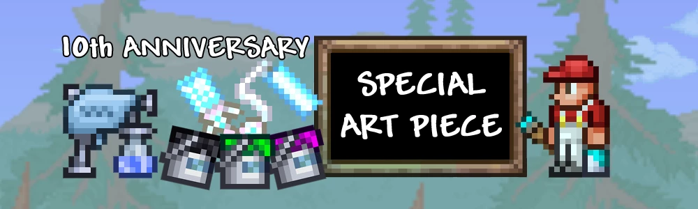 В настоящее время мы работаем с художником сообщества над тем, что, по нашему мнению, будет удивительным - и удивительно подходящим - произведением искусства в мире. празднование десятилетия Террарии. Об этом станет известно накануне самой годовщины на выходных. Что это будет? Кто художник? Вам придется подождать и узнать!