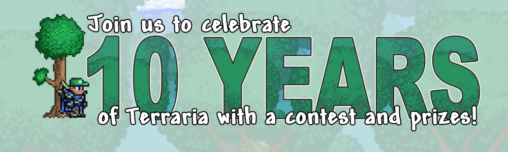 Вы можете в это поверить? Игра, которую все мы так хорошо знаем и любим, вот-вот исполнилось десять лет! Несомненно, это был долгий и удивительный путь, который нам понравился - путешествие, полное поворотов, взлетов и падений и множества сюрпризов на этом пути. Еще более безумно то, что Terraria сильнее, чем когда-либо, на пороге своего второго десятилетия - и конца этому не видно!
