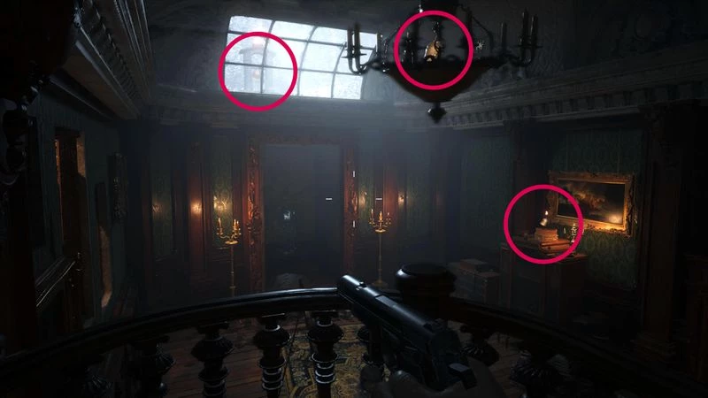 4. Люстра. Поднимитесь по лестнице, которая явно ни к чему не ведет, и посмотрите на люстру. Колокольчик находится наверху. Возможно, вам придется выстрелить в него дважды - один раз, чтобы он качнулся, и еще раз, чтобы он засветился