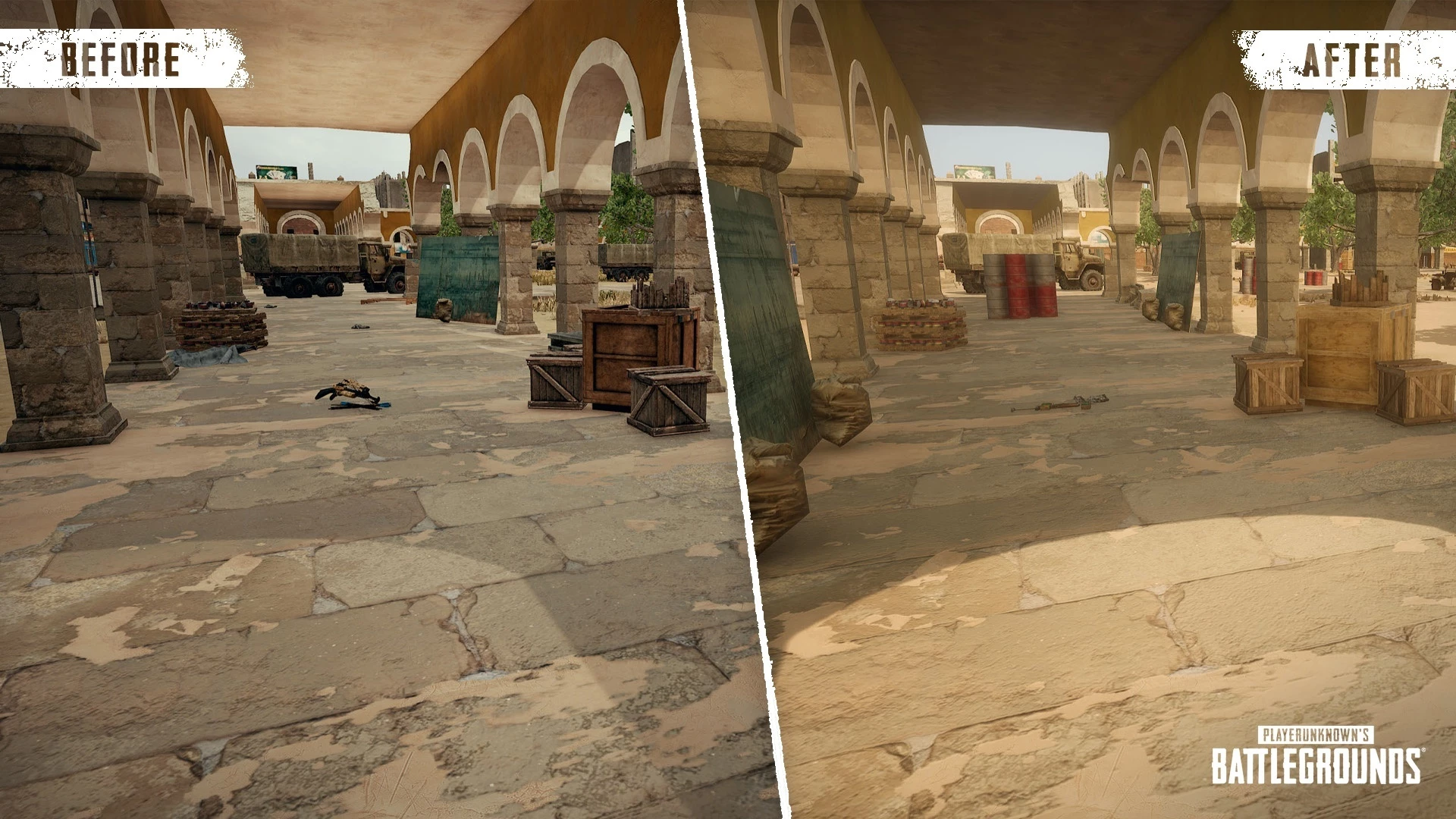 В существующих типах погоды: Солнечная, Закат, Восход и Облачно интенсивность и цвет были скорректированы. Sandstorm и Dusk будут представлены в режиме Challenger. Наконец, были доработаны бункер и внутреннее освещение.