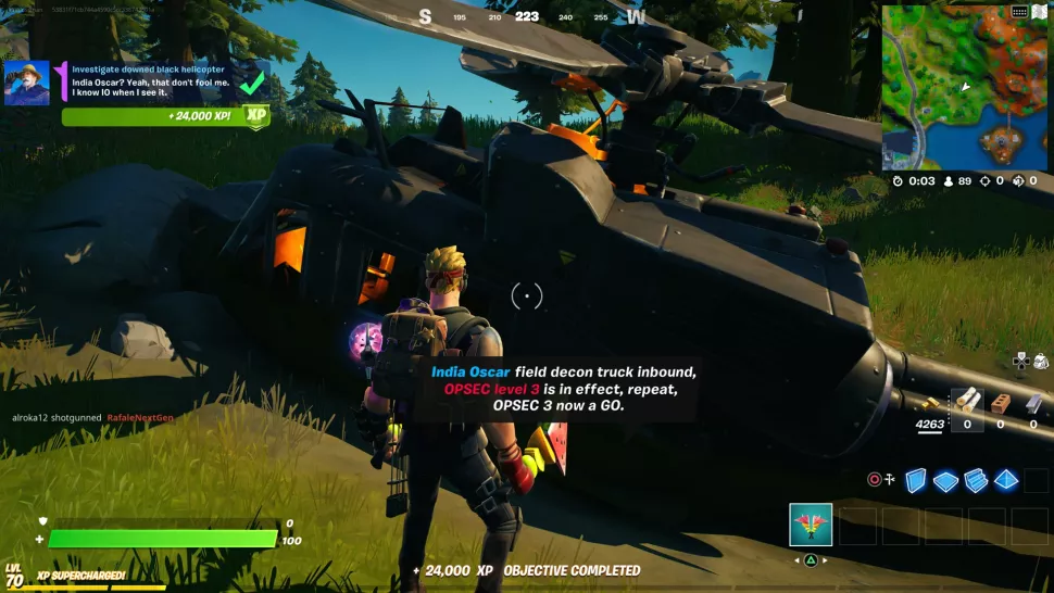 Как только вы приблизитесь, чтобы исследовать сбитый Fortnite черный вертолет, вы выделите его и увидите подсказку «Настроить» для взаимодействия. Это дает вам кнопки плюс и минус, которые нужно нажимать, чтобы правильно услышать передаваемое секретное сообщение, поэтому нажмите их несколько раз, и вы завершите квест, получив следующую трансляцию: