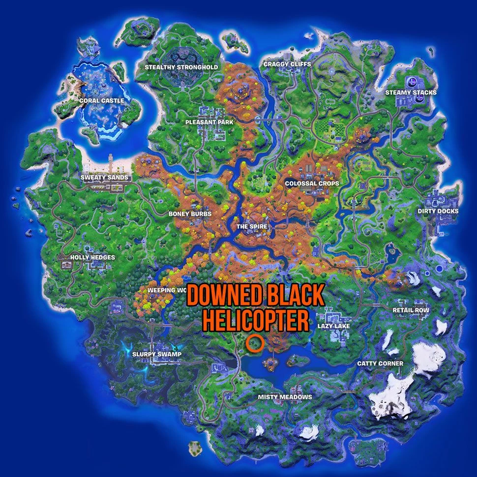 Местоположение сбитого черного вертолета Fortnite можно найти на северо-западном побережье большого озера, между плотиной Hydro 16 и Стражей башни на острове. Он расположен на скалах у края большой группы деревьев, хотя сгоревший снаряд дымится и искрится, поэтому его не составит труда обнаружить, когда вы окажетесь в нужном месте.