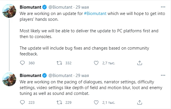 «Мы работаем над обновлением для Biomutant, которое, как мы надеемся, скоро попадет в руки игроков», - говорится в сообщении Experiment 1O1. «Скорее всего, мы сможем доставить обновление сначала на платформы ПК, а затем на консоли».