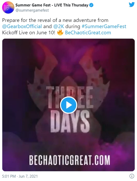 Чуть ниже вы можете увидеть объявление, сделанное ранее 7 июня в официальной учетной записи Summer Game Fest в Твиттере, о том, что новая игра от Gearbox будет представлена во время специальной презентации в этот четверг, 10 июня. Прямо сейчас мы должны предоставить всю официальную информацию. - это сайт- тизер BeChaoticGreat.com , на котором вместе с анонсом была запущена таинственная презентация новой игры.