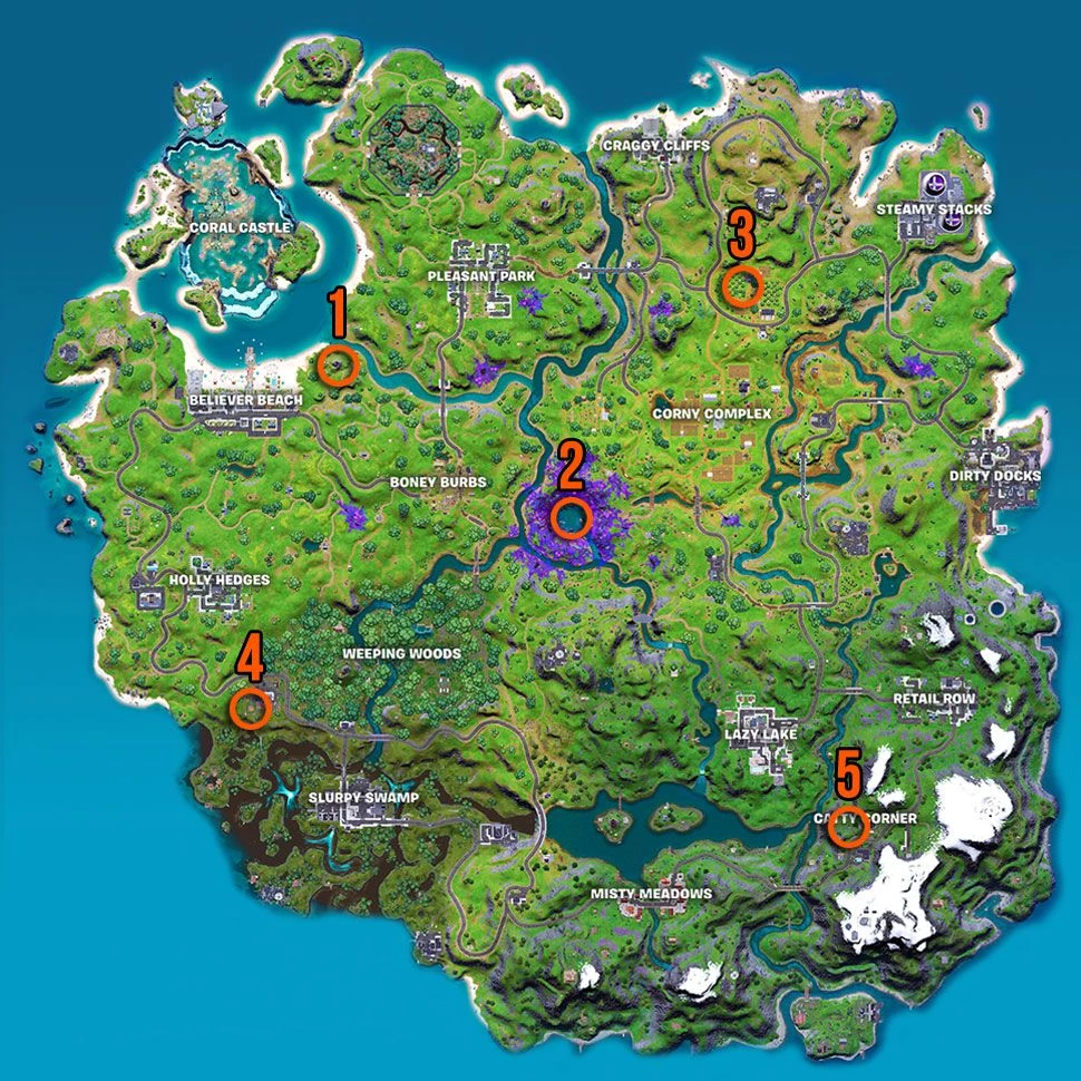 Есть два способа найти этот предмет: первый - посетить одно из пяти мест инопланетных артефактов Fortnite, отмеченных на карте выше. Когда вы прибудете в любую из следующих областей, вы увидите артефакт, парящий в защитной оболочке