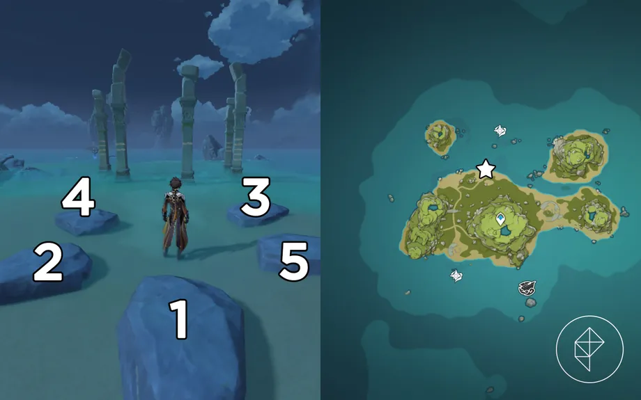 После того, как вы установите пруды, направляйтесь в северную часть центрального острова, где находятся пять каменных столбов . Здесь есть еще пять рок-педалей . Встаньте на них в порядке, указанном столбами.