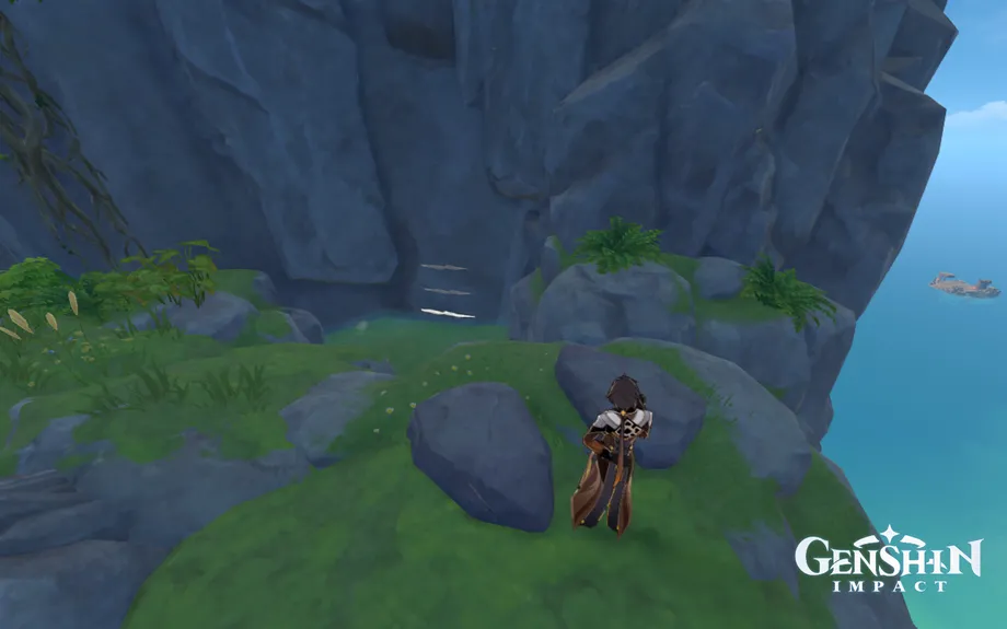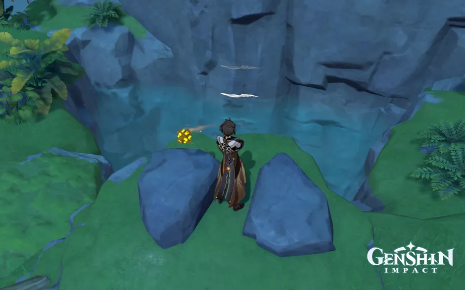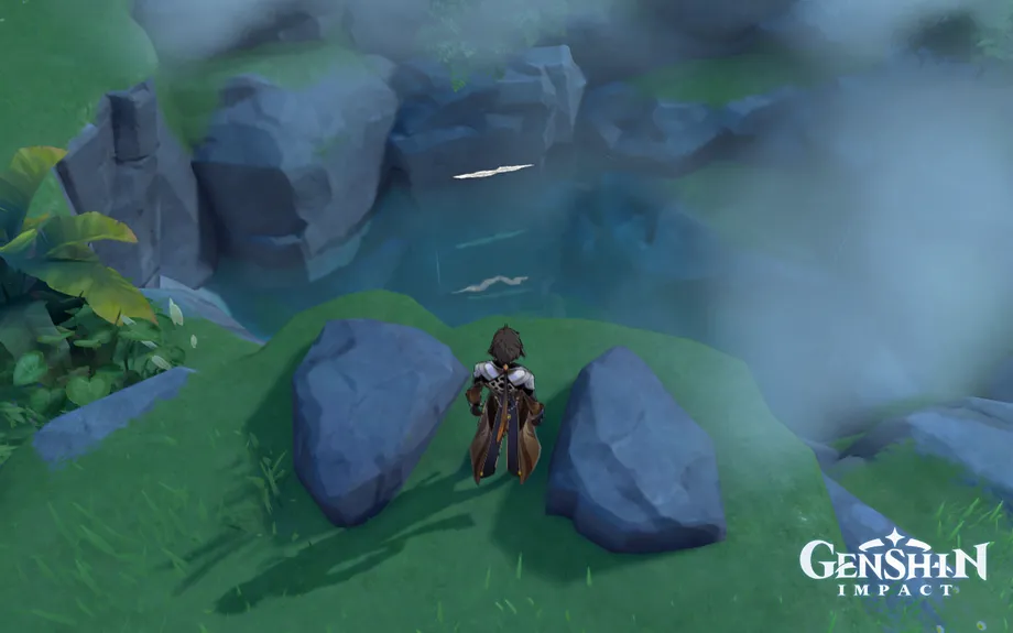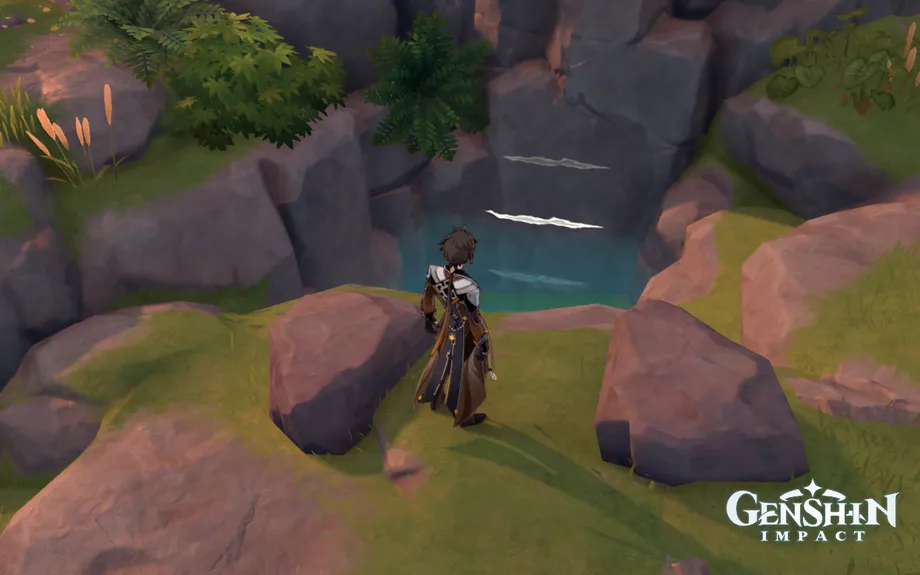 Когда вы подойдете к нему, этот пруд будет фактически пуст. Над ним, выше на утесе, есть разрушающаяся скала. Разбейте его пользователем клеймора, чтобы наполнить бассейн водой.