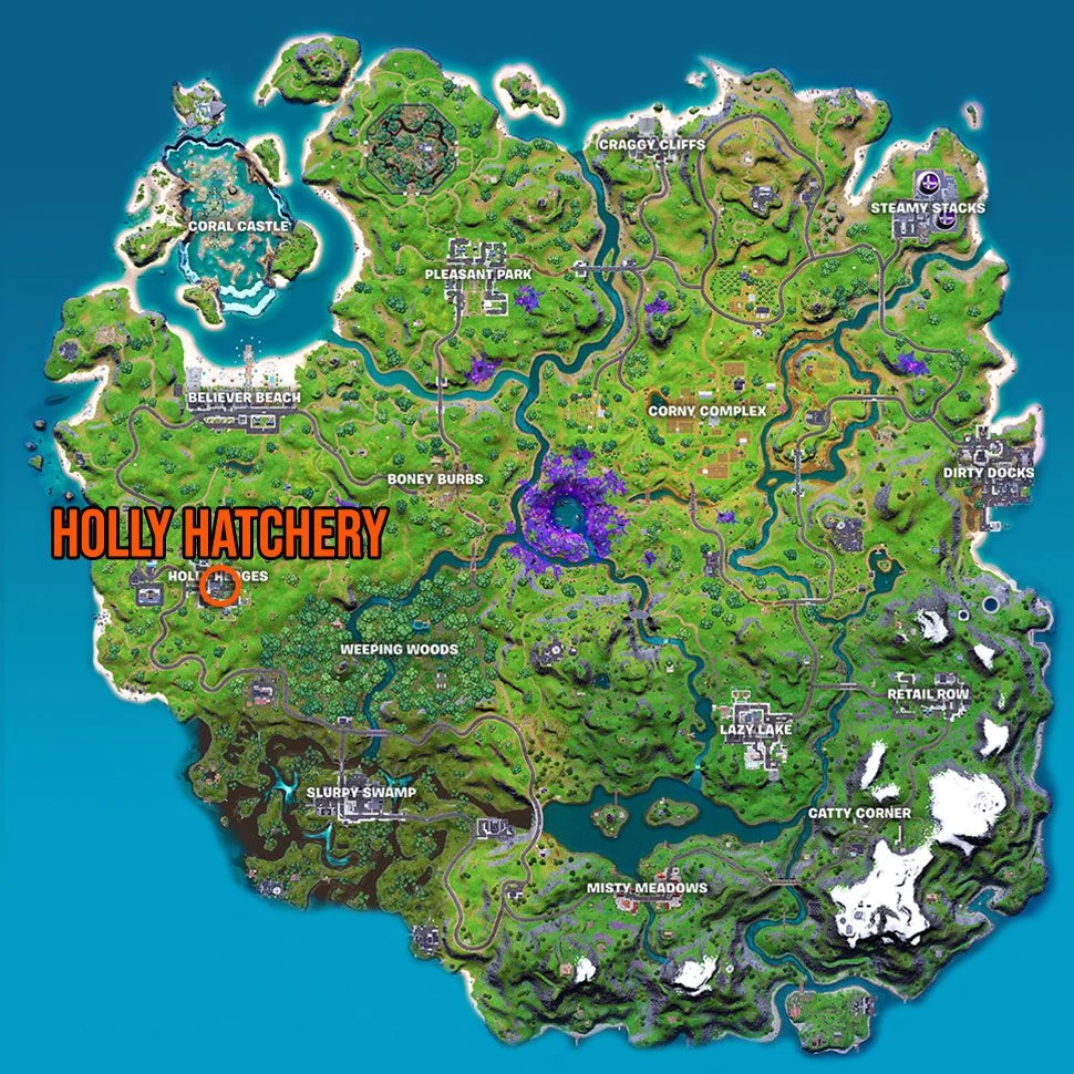 Вы найдете Fortnite Holly Hatchery, что неудивительно, в месте, которое ранее было Холли Хеджес на западной стороне острова. Остерегайтесь, так как теперь, когда они захватили этот район, в этом районе может увеличиться присутствие инопланетян.