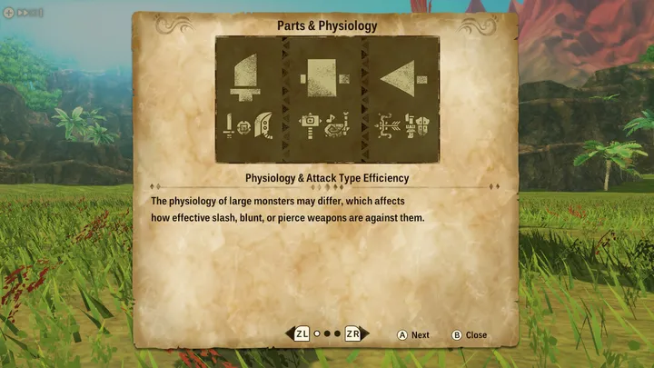 Когда вы нацеливаетесь на монстра, вы увидите, какой тип оружия причиняет им больше всего вреда. Если существо слабо обращено с оружием, значок этого типа оружия будет выделен синим цветом после того, как вы атакуете его этим оружием. Если тип оружия неэффективен против монстра, он будет иметь красную черту.