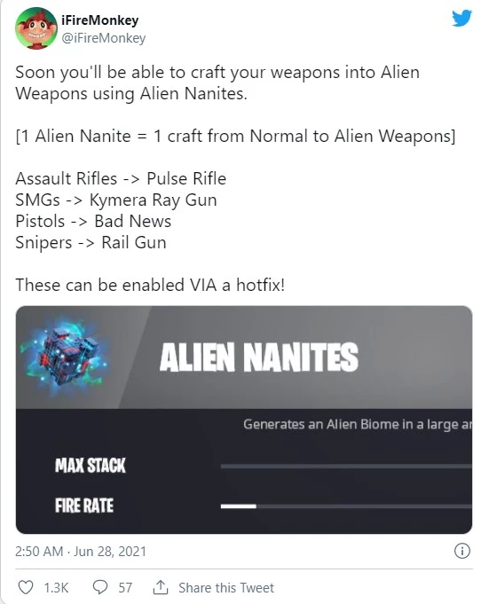 Другое использование Fortnite Alien Nanites - это материал для изготовления предметов, объединяющий существующие гайки и болты. Используя крафт Fortnite для объединения нанитов с определенным базовым оружием, вы можете производить улучшенное оружие пришельцев, такое как импульсная винтовка, Kymera Ray Gun, Rail Gun и новый пистолет Bad News. Удобно, что вам понадобится всего одна единица Fortnite Alien Nanites для создания каждого оружия, поэтому стоит держаться за них, чтобы значительно улучшить свой арсенал.