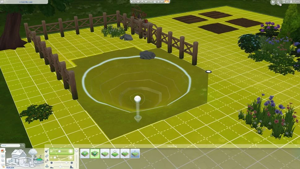 В режиме строительства / покупки перейдите к инструментам ландшафта и выберите «Нижний ландшафт» в области «Инструмент рисования». Затем вы можете использовать это, чтобы сделать основную форму вашего пруда. Вы можете переключаться между стилями кисти (круглой или квадратной) и регулировать скорость, с которой ваш инструмент врезается в землю, что позволяет вам немного легче контролировать глубину.