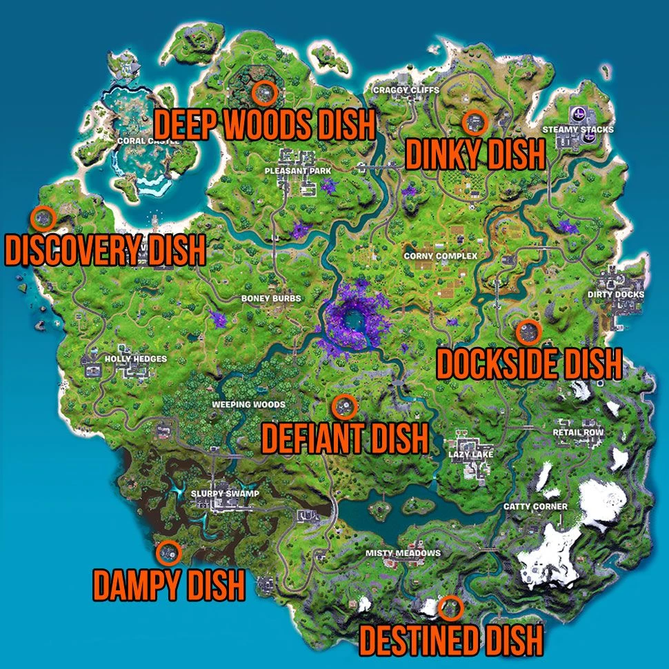 Всего вокруг острова семь спутниковых станций Fortnite, и вы сможете заметить их, когда приблизитесь, благодаря их выступающим тарелкам с горящими красными огнями на конце. Их отдельные местоположения следующие: