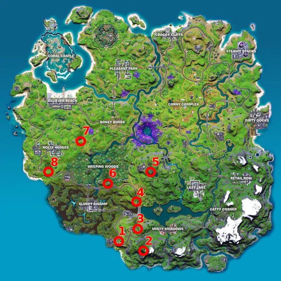 Взаимодействуйте с подсказкой, когда вы приблизитесь, и зонд будет доставлен в базовый корабль. Поскольку зонды Fortnite довольно маленькие и их легко пропустить, вот все восемь областей более подробно: