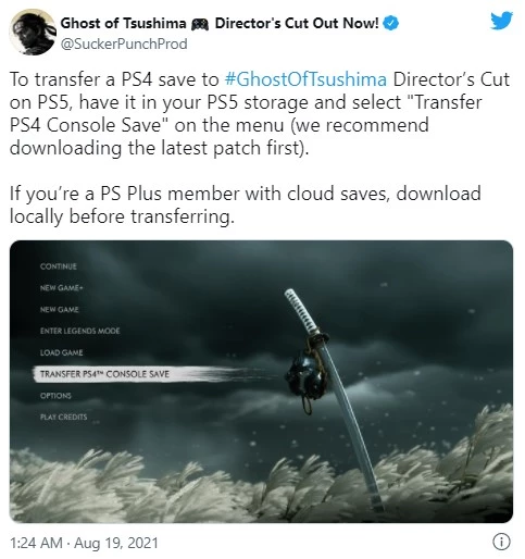 В своем твите ранее сегодня разработчик Sucker Punch сообщил фанатам, «чтобы перенести сохранение PS4 в Ghost of Tsushima Director's Cut на PS5 , поместите его в хранилище PS5 и выберите в меню« Перенести сохранение консоли PS4 » . Студия заявляет, что рекомендует сначала загрузить патч, и инструктирует участников PS Plus, использующих облачные сохранения, загрузить локально, прежде чем пытаться сделать передачу сохранения.