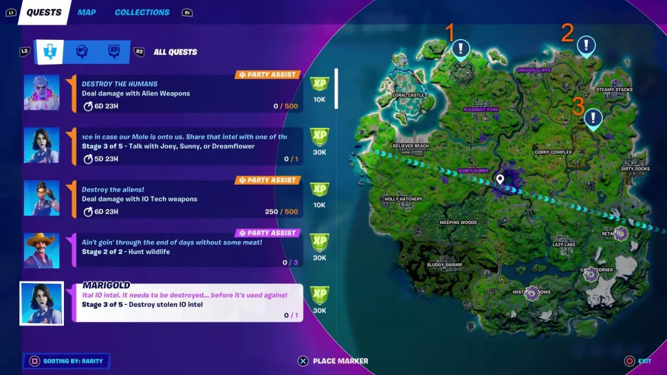 Мэриголд наградит вас 30 000 XP за выполнение этого эпического квеста, который поможет вам повысить уровень боевого пропуска в этом сезоне. Завершение всех эпических испытаний Marigold Fortnite Epic на 13 неделе принесет вам в общей сложности 210 000 XP, так что вам стоит поискать кусочек информации, который нужно уничтожить, прежде чем Fortnite Chapter 2, сезон 8 закончится .