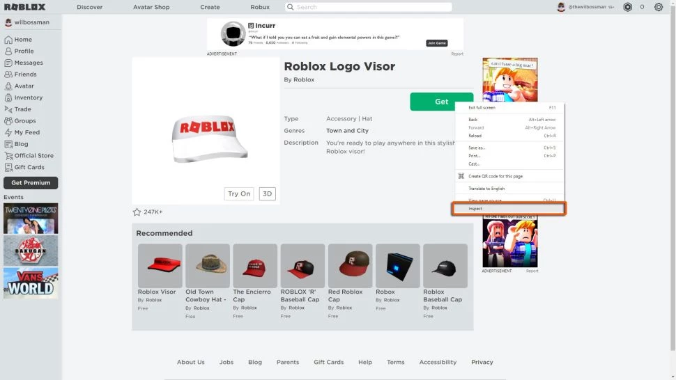 Затем посетите магазин аватаров Roblox в браузере Chrome и выберите любой элемент, отмеченный как бесплатный - неважно, какой элемент вы выберете, поскольку следующие шаги не повлияют на этот элемент. Щелкните правой кнопкой мыши кнопку «Получить» для этого элемента, затем выберите параметр «Проверить» внизу списка.
