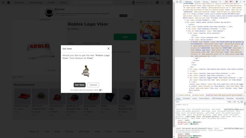 После внесения этих изменений кода вернитесь на главный экран магазина аватаров и щелкните левой кнопкой мыши кнопку «Получить». Хотя имя исходного элемента, который вы выбрали, появится в приглашении, вместо этого вы должны увидеть изображение шляпы Roblox Monkey Safari, а затем выбрать опцию Get Now.