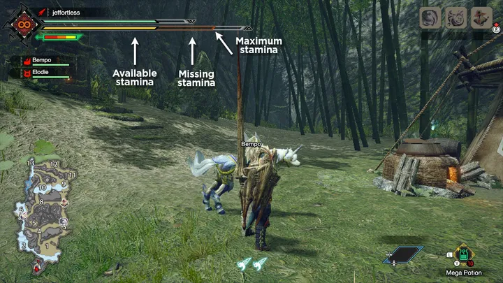 Ваша выносливость представлена длинной желтой полосой под зеленой полосой здоровья. Такие действия, как бег, уклонение, использование Wirebugs и атака, требуют выносливости. Когда вы отдыхаете, ваша выносливость медленно восстанавливается.