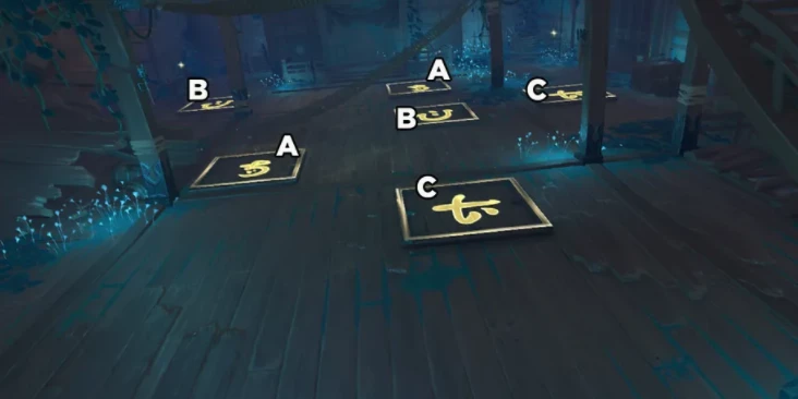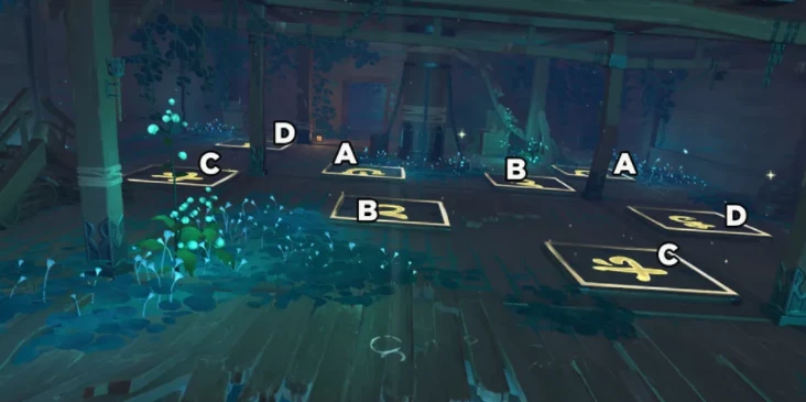 Решите головоломку, прежде чем спрыгнуть вниз. Эта загадка решается соединением двух плиток вместе, наступая на них. Наступите на одну, а затем наступите на плитку с таким же символом. Мы отметили решение ниже: