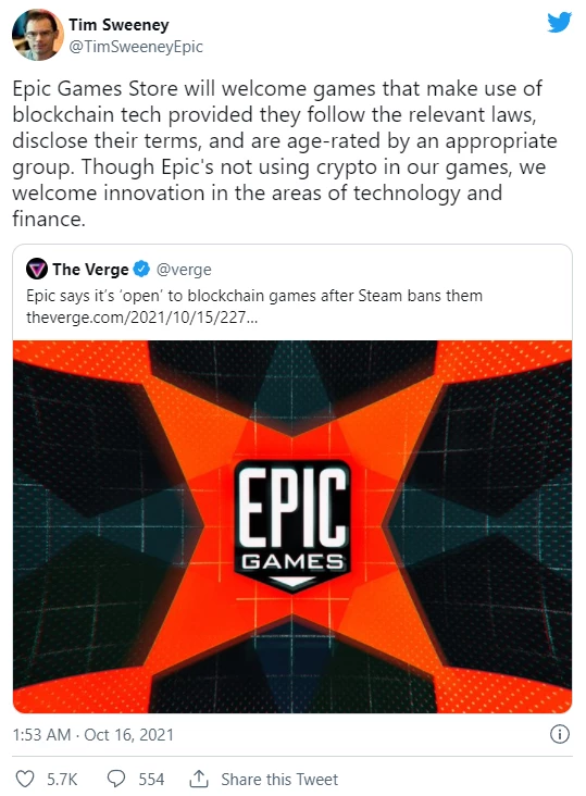 Epic Games Store, с другой стороны, по-видимому, продолжит принимать игры с технологией блокчейна - по крайней мере, об этом недавно написал в Твиттере босс Epic Games Тим Суини в ответ на фурор.